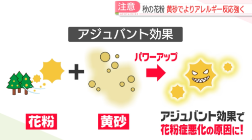 季節外れの黄砂が飛来しています。黄砂は体にさまざまな影響を及ぼします。くしゃみ、鼻水、鼻づまり、目のかゆみといったアレルギーの症状が現れます。また、黄砂は秋の花粉に付着するとアレルギーを強める「アジュバント効果」ががあります。アジュバント効果とは、ある物質が別の物質に作用して本来のアレルギーを強くするというもので、黄砂やPM2.5が関係します。今、秋花粉がまだ飛んでいますので、アジュバント効果により花粉症の症状をより強く起こすことがあります。この時期に、花粉症の症状がある人は特に注意が必要です。季節外れの黄砂の飛来から身を守るためにも、マスクの着用や外から帰宅した際に黄砂を払い落とすなど対策を心がけましょう。